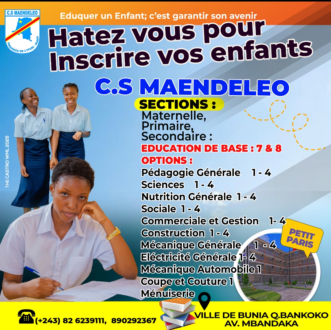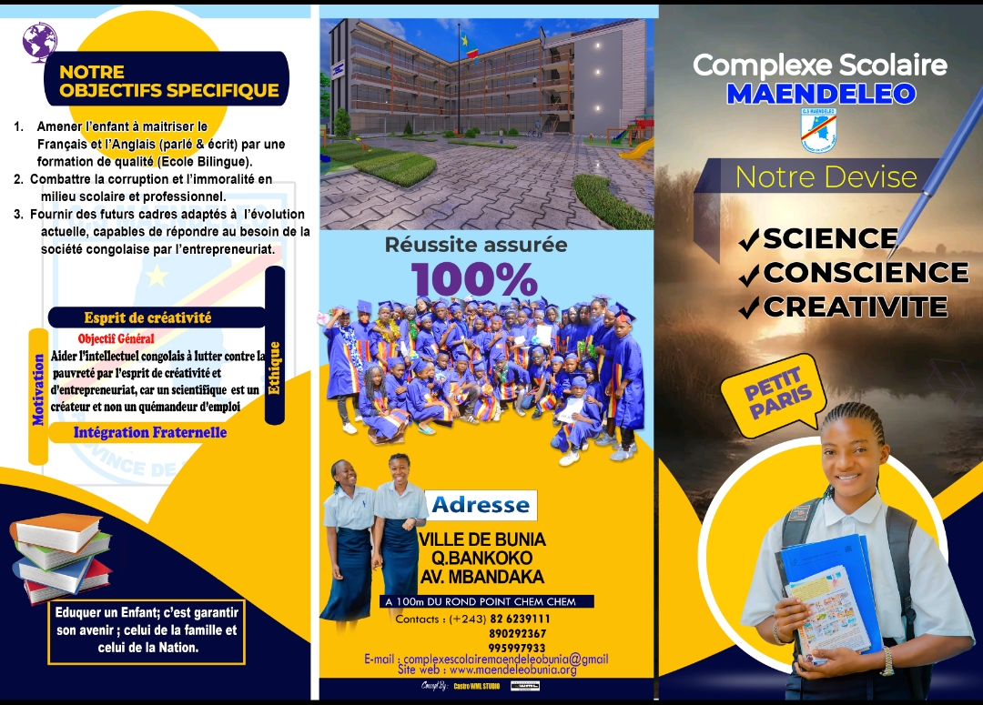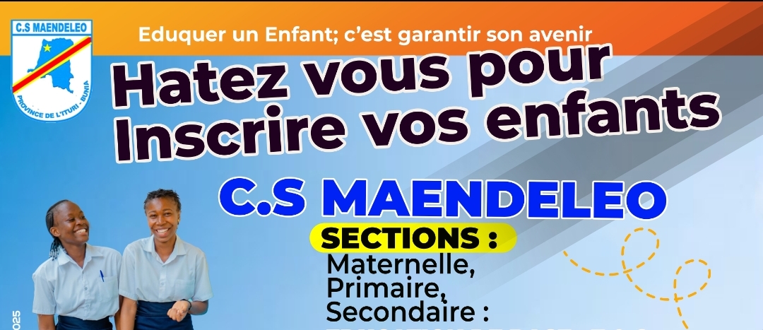 Le Complexe Scolaire Maendeleo Bankoko a débuté depuis le 4 août avec les inscriptions des nouveaux élèves et la confirmation des places pour les anciens. Annonce contenu dans un communiqué scolaire de cette école privée agréée située sur l’avenue Mbandaka, Quartier Bankoko, Commune Mbunya en ville de Bunia, à quelques mètres du rond point Chem Chem.
