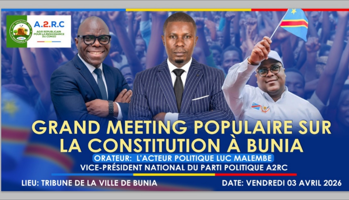 Le parti politique Agir Républicain pour la Renaissance du Congo A2RC a organisé un meeting populaire ce vendredi 03 Avril en ville de Bunia ,dans la province de l’Ituri